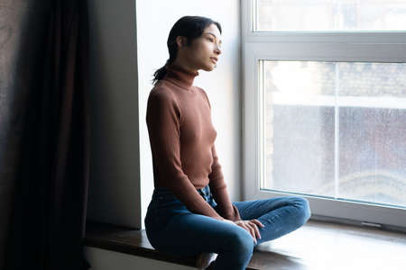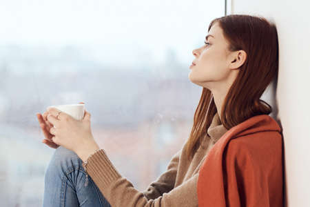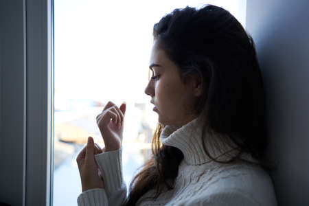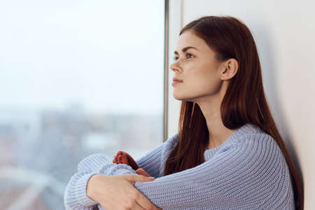 Portrait of a young pensive woman sitting by the window. Close-up.