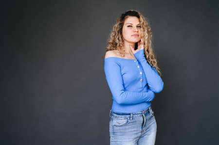 Horizontal photo of a curly blonde woman in a blue sweater, jeans, standing sideways, arms folded on her chest posing on a gray background