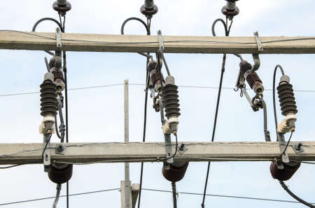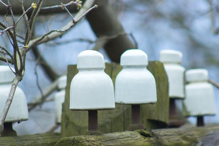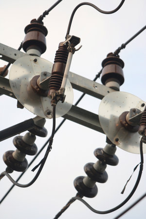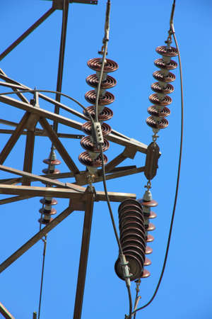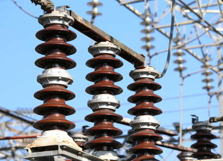 Electric power equipment, hv porcelain and metal stents, closeup of photo