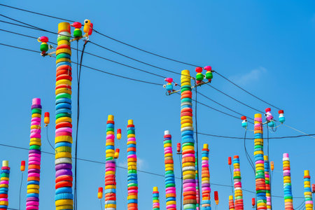 An electricity pole with colorful insulators and wires against a clear blue sky, highlighting the technical details and vibrant components