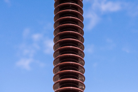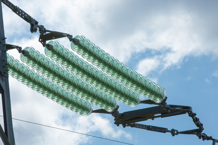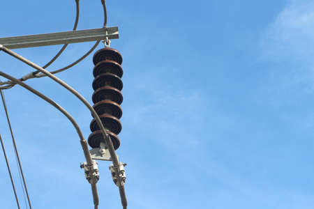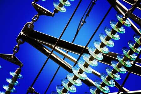 Close-up of insulators on high voltage pylons against the background of blue sky. Made in a sunny day, deep blue skies