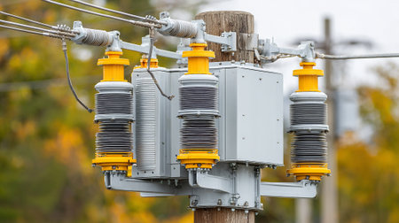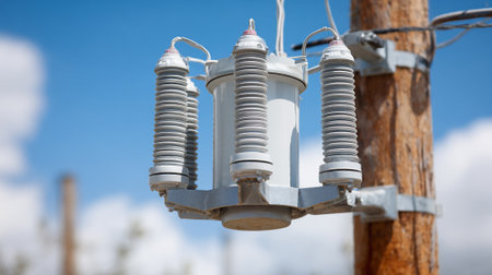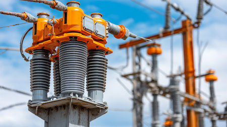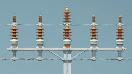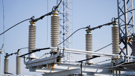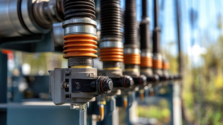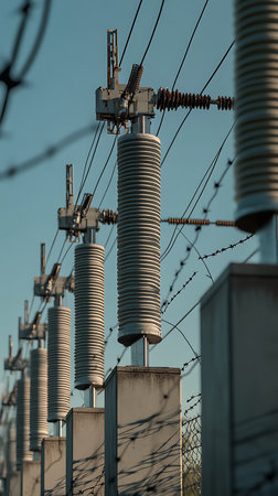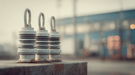 This close-up image showcases electrical insulators in a substation, highlighting essential industrial elements for high voltage equipment and emphasizing safety and reliability in energy transmission.