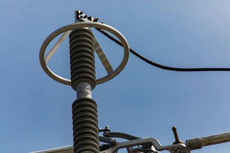 Polymer ceramic insulator with high voltage. Dangerous engineering facility. Close up.