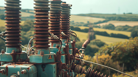 High Voltage Electrical Equipment in a Rural Landscape. Concept of Renewable Energy, Sustainable Technology, Power Infrastructure. Power station.