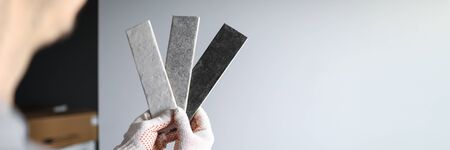 Mock up from natural stones, top view, close up. Female hands advertises repair materials. Floor tiles, tiles, countertops.