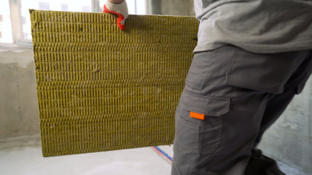 Fragment of wall insulation of the building with heat-insulating mineral wool fixed with plastic clips. The concept of reducing heat loss in modern buildings, copy space, close-up.