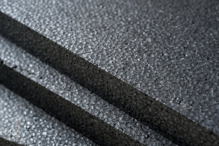 Top view of gray thermal insulation styrofoam sheets stacked on top of each other