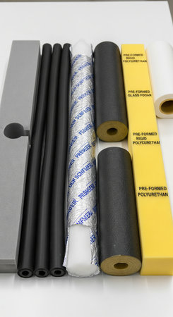 Various samples of pre-formed insulation materials including polyurethane and glass foam for construction and industrial thermal applications., vertical.