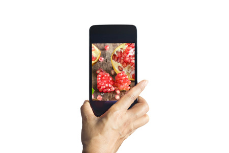 Smartphone take photos of pomegranate on isolated background