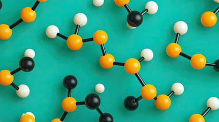 A vibrant depiction of a molecular structure featuring red, white, and black spheres against a bright teal background. Ideal for educational and scientific contexts.