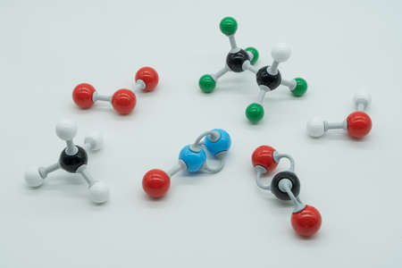 Picture of different greenhouse gases made by molecular model on white background. Chemical formula of nitrogen monoxide, carbon dioxide, methane, water, ozone and HFC - 125.