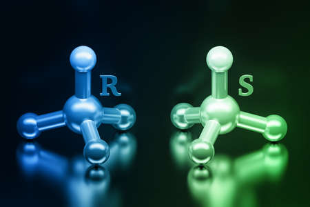 Blue and green science concept of simple molecules. Presentation of stereoisomers enantiomers with letters R and S standing for rectus and sinister. 3d illustration.
