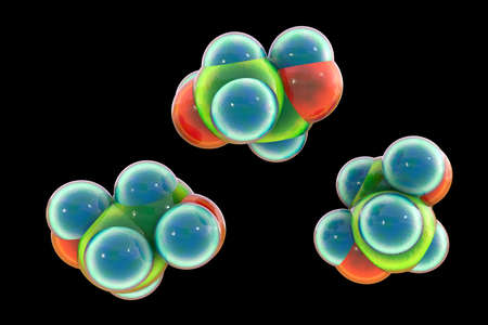 Ethylene glycol molecules, 3D illustration. An organic compound used in the manufacture of polyester fibers and for antifreeze formulations in the coolant in automobiles, air-conditioning systems
