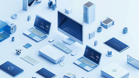 Highly rendering of a laptop surrounded by electronic devices on blue background