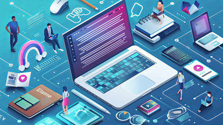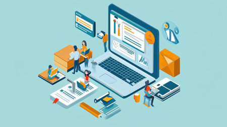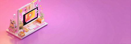 This isometric illustration features a laptop surrounded by various digital icons and a clock. The composition utilizes a vibrant color palette, with a focus on purple and orange. The rendering style suggests a modern, digital environment. The image is suitable for use in websites, presentations, and other commercial purposes.