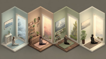 Different meditation areas feature unique views of nature through windows, promoting tranquility and mindfulness. Each space reflects a distinct atmosphere.