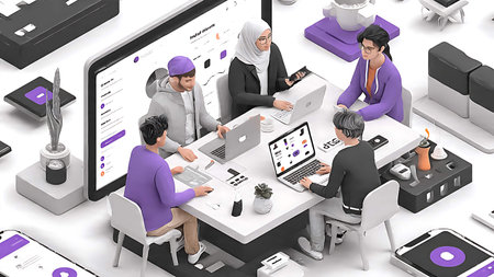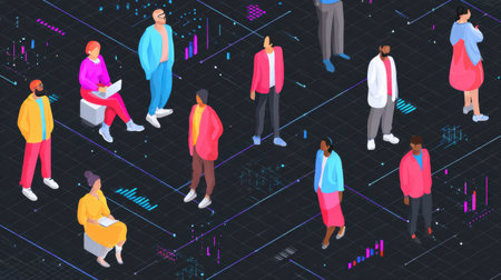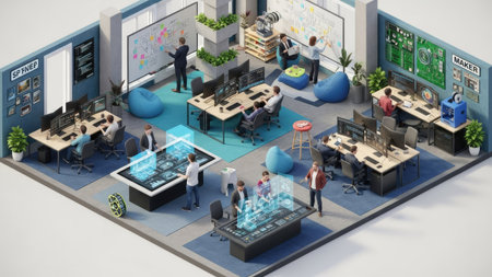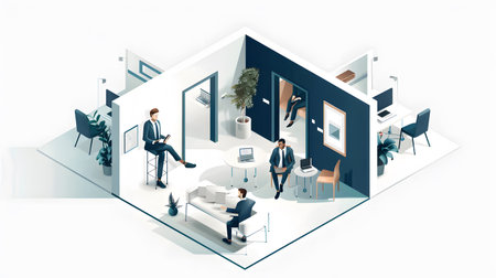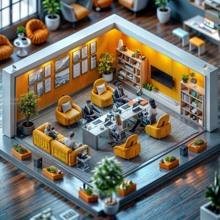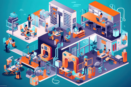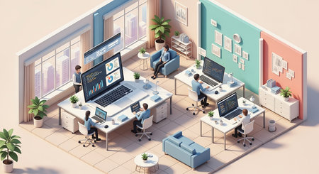 An isometric office scene depicts several people engaged in collaborative work activities. The image showcases a modern interior design with vibrant colors, soft lighting, and a diverse range of technology. This scene could be used for illustrating topics such as teamwork, technology, or business strategy.
