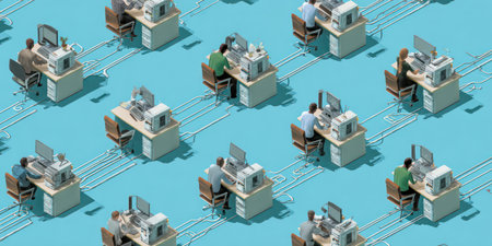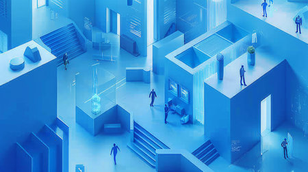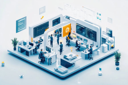 An isometric view showcases numerous office desks, each occupied by a person using a computer. The scene is set against a solid blue backdrop. The style presents a clean and modern aesthetic. The image is suitable for various commercial purposes, including marketing and design applications, illustrating concepts of business and technology.