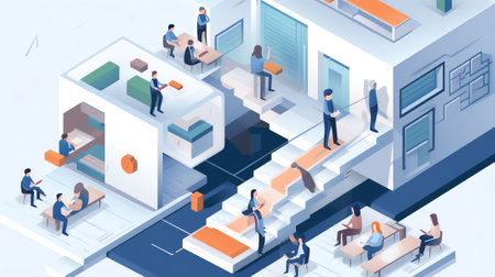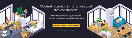 Landing page Isometric. The header of the site with a vivid illustration of student life. Student dormitories for a pleasant stay for students. Trendy vector style