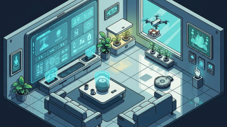 An illustration depicts a modern living space with advanced technology integration. The scene showcases digital interfaces, automated systems, and a drone. The composition uses a flat, isometric perspective with cool blue and green hues, suggesting a futuristic domestic environment with various technological elements suitable for editorial or commercial projects.