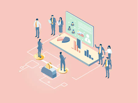 Business people working together, solving the problems, making decisions and progress. Isometric environment illustration