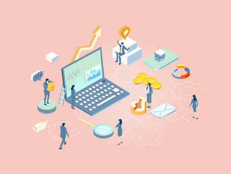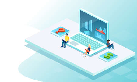 Vector of business people working on laptop computers analysing internet financial data and traffic