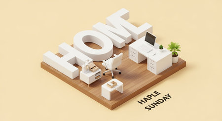 An isometric 3D showcasing the word HOME formed by large, white letters. The letters are placed on a wooden platform, and within the 'O' and 'M' letters, a compact and modern home office is depicted. This includes a white desk with a computer and keyboard, a swivel chair, a small side table with a lamp, and a potted plant. The background is a soft beige. The overall style is minimalist and clean, emphasizing a functional and organized workspace.