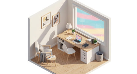 A beautifully rendered 3D isometric diorama of a cozy home office. The scene, in soft pastel hues, shows a tidy desk with a glowing laptop, suggesting a peaceful work-from-home setup.