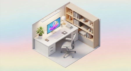 A minimalist isometric view of a modern home office. The scene a white L-shaped desk with a computer monitor displaying a colorful keyboard, mouse, and a desk lamp. A green potted plant adds a touch of nature. Adjacent to the desk is a light wood bookshelf filled with books and decorative A comfortable white office chair is positioned at the desk. The background is a soft gradient of pastel colors, creating a serene and inviting atmosphere. is concepts related to remote work, study, or...