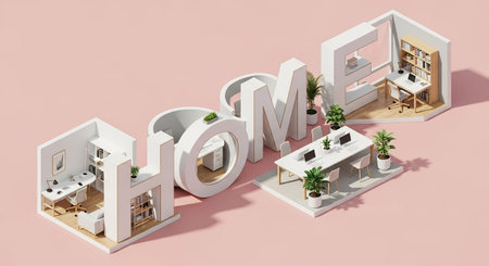 An isometric view of a miniature home interior featuring the word HOME integrated into the architecture. The space is divided into distinct zones: a modern home office with a desk and computer, a comfortable seating area with an armchair and coffee table, and a cozy lounge nook with a circular desk and sofa. Natural light streams in, creating a warm and inviting atmosphere. The is clean, organized, and contemporary, illustrating a versatile and stylish living and working space.