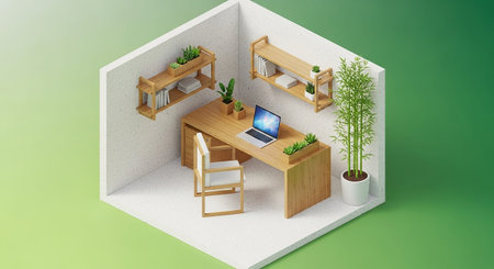 A serene isometric view of a home office designed with natural The scene showcases a long, sleek wooden desk with a laptop and a planter filled with greenery. A simple white wooden chair is placed at the desk. Two narrow wooden shelves are mounted on the wall, holding books and small plants. A tall potted bamboo plant in a white pot adds a significant natural to the right side of the composition. The overall atmosphere is peaceful, minimalist, and organized, with a focus on natural and a...