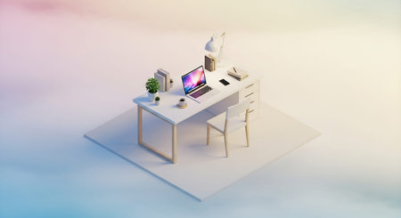 A minimalist isometric workspace featuring a clean white desk with a laptop displaying a colorful screen, a desk lamp, books, a potted plant, and a coffee cup. A simple wooden chair is positioned at the desk. The scene is rendered in a soft, pastel color palette with gentle lighting, creating a serene and modern atmosphere. The desk is placed on a white platform, with a blurred, gradient background of pink, yellow, and blue hues.