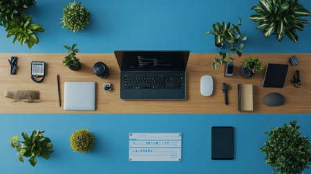 A beautifully arranged modern workspace showcasing a laptop, smartphone, and lush green plants on a wooden desk, emphasizing productivity and contemporary design.
