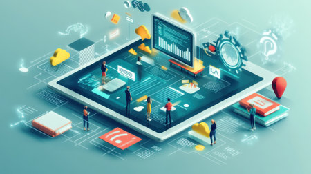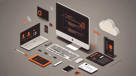 Isometric interface concept with multi-device syncing, cloud storage, and task management