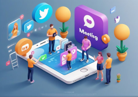 A vibrant 3D illustration showcasing a network of connected people. The design features colorful geometric shapes, symbolizing communication and collaboration in a digital landscape.