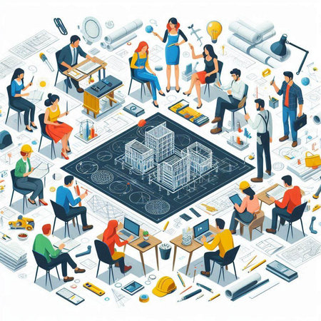 Architecture and construction isometric composition with people working on project on blueprint vector illustration