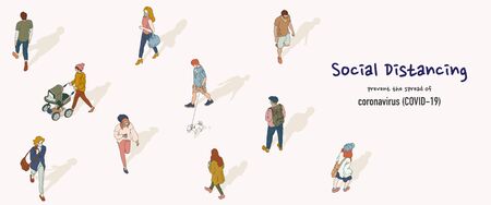 Vector banner of social distancing concept. People keep distance from each other in public to protect from COVID-19. Hand drawn style illustration.