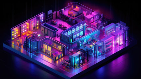 3D isometric illustration of a factory building with neon lights.