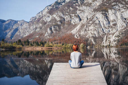 Young woman is sitting on wooden bridge of beautiful nature around by the Bohinj lake in Slovenia. The Triglav National Park, Julian Alps, Slovenia.