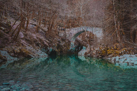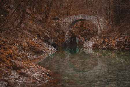 Beautiful stone bridge on Nadige or Nadiza river, called old Napoleon bridge. Enchanted magical stone bridge in cold late autumn environment. View over Water.