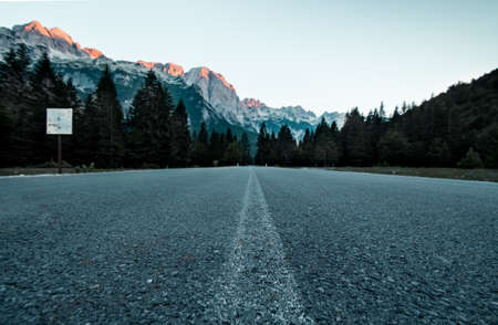 A low angle shot of a road in a forest surrounded by trees with mountains in the distance in Valbona Valley National Park Albania
