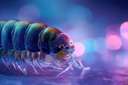 Colorful macro photograph of a close-up crustacean with shining metallic exoskeleton, segmented body, detailed antennae and legs, set against vibrant bokeh lights in pink and blue hues