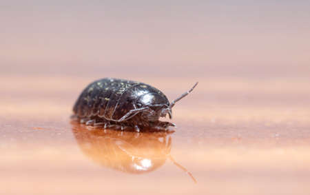 Pill Bug Armadillidium vulgare crawl on branch grey background upside down