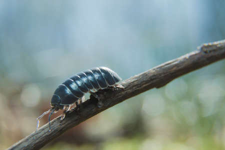 Pill Bug Armadillidium vulgare crawl on branch grey background side view