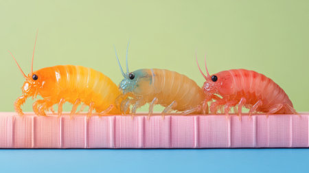 Three vibrant amphipods are displayed on a pastel-colored surface, showcasing their unique hues of orange, blue, and pink, highlighting their intricate features and textures.