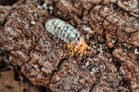 Purple Roly Poly pill bug also known as a woodlouse in natural habitat decaying wooden debris