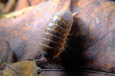 Detailed closeup of crawling common shiny woodlouse (Oniscus asellus) on a piece of wood in forest.