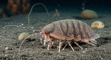 Close-up of a Sea Roach exploring a dark environment, showcasing its segmented body and delicate antennae, macro photography and don't have generated by AI.