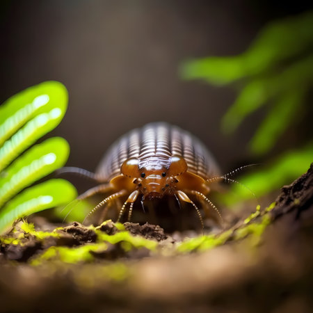 A detailed macro photograph captures the intricate world of a tiny isopod as it navigates its environment. The shallow depth of field and warm lighting highlight its complex features, inviting a sense of wonder about the hidden ecosystems all around us.