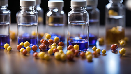 A close-up image of several glass bottles filled with a blue liquid, scattered pills on a wooden table. The image represents science, medicine, and research.